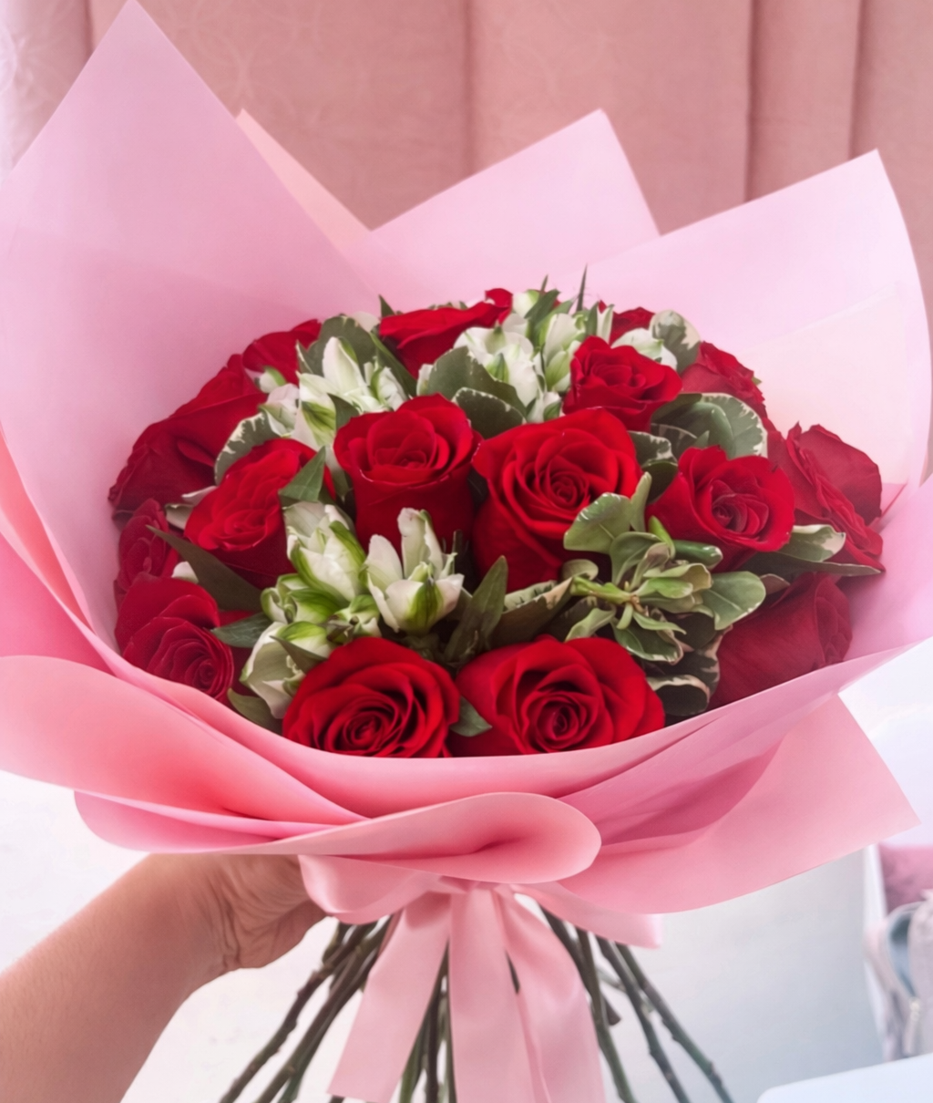 Celebra aniversarios y cumpleaños con nuestro ramo de 24 rosas rojas y astromelias blancas. Un regalo que simboliza la duradera pureza y la sofisticación de tu amor. ¡Hace que los momentos especiales sean aún más memorables!